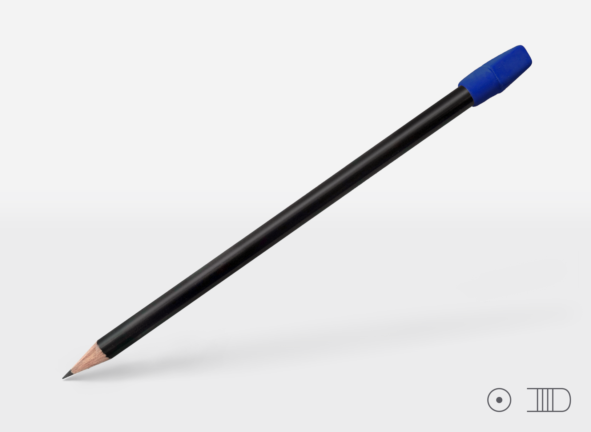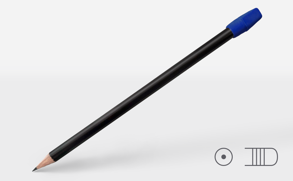 Unser schwarz glänzender Bleistift mit blauem Aufsteck-Radiergummi.