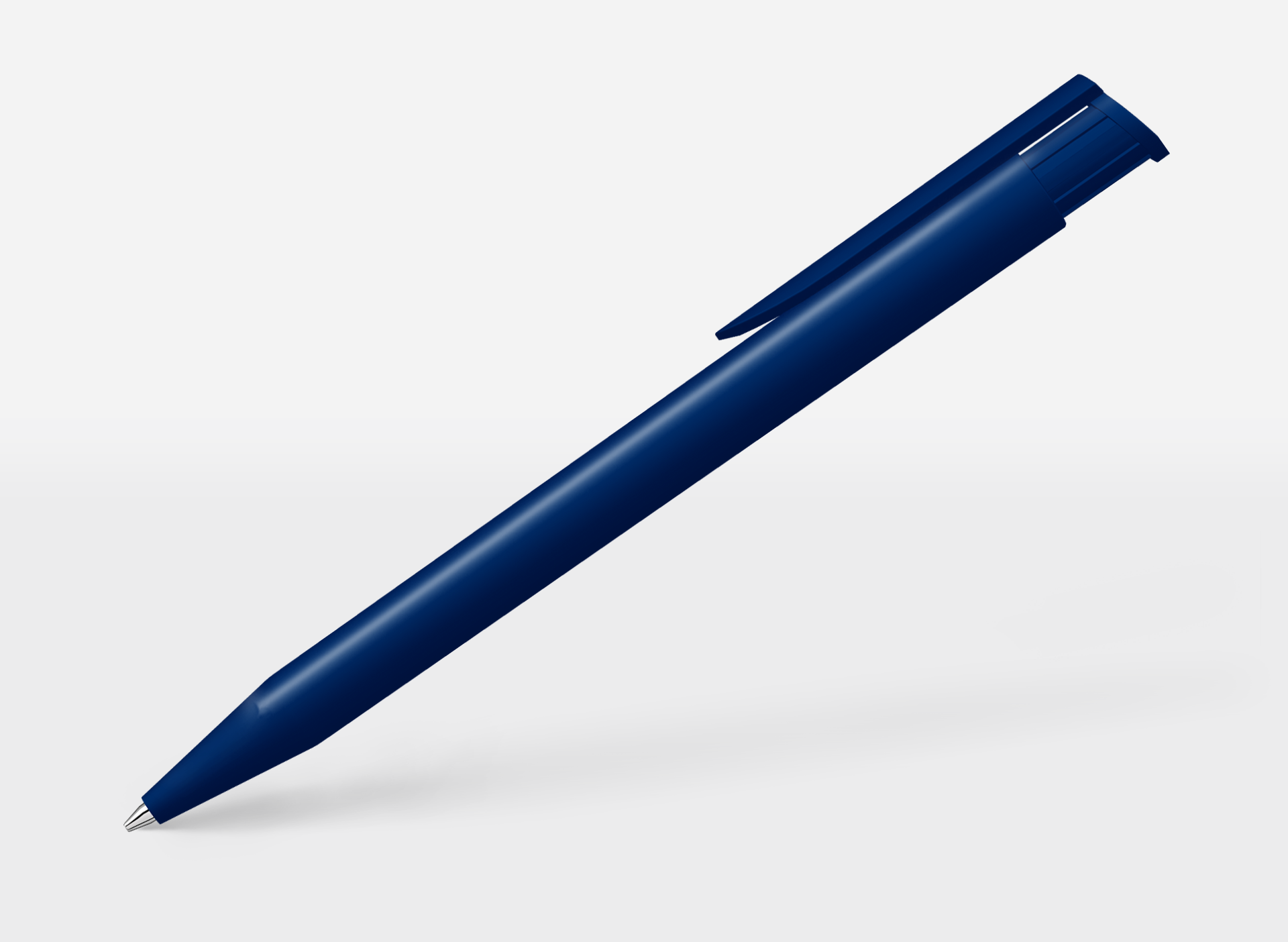 Retractable ballpoint pen with dark blue soft-touch surface (similar to Pantone 0280C) and soft-touch clip pusher